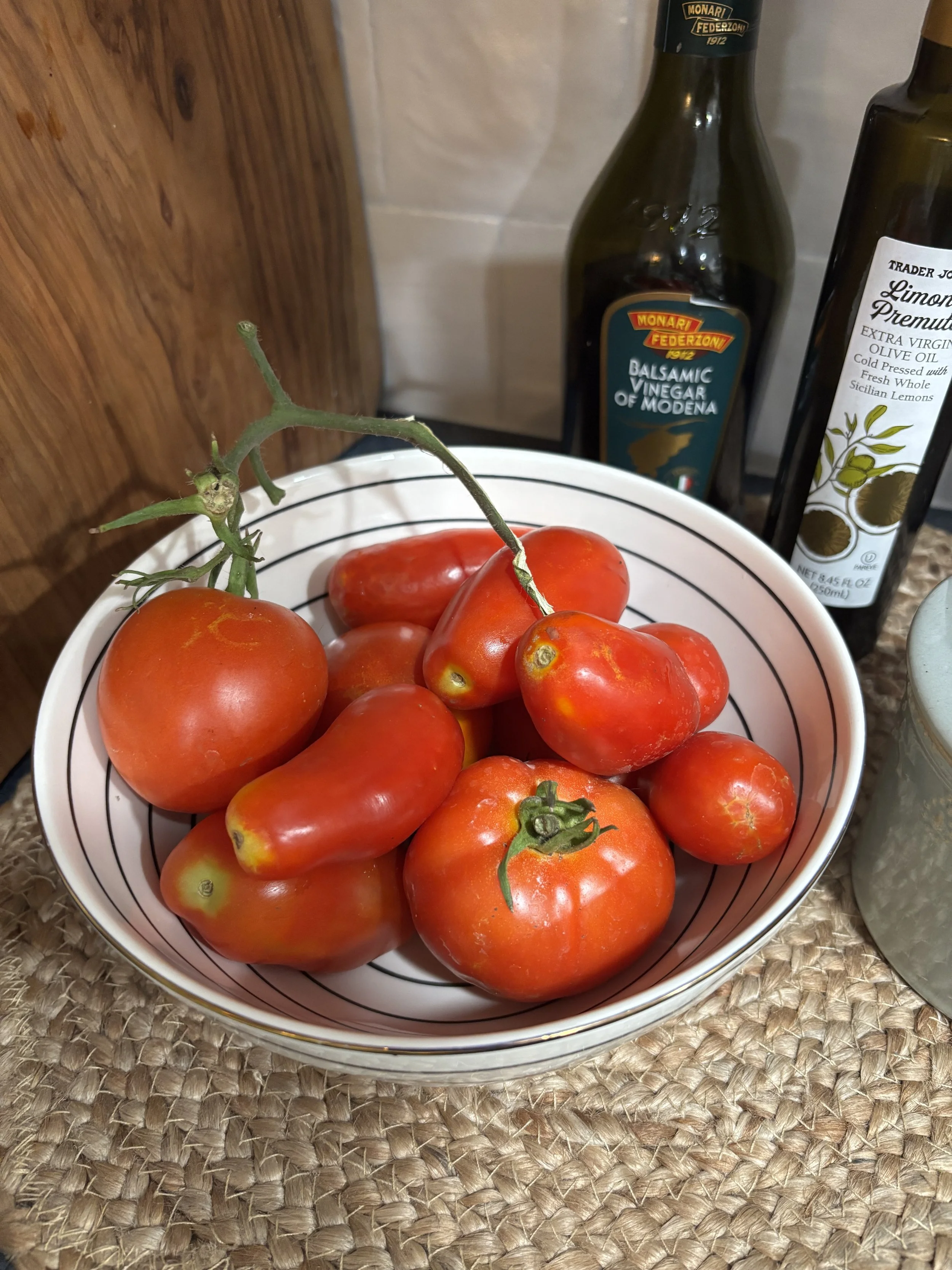 Here is this week’s tomato harvest. My son loves wandering into the garden, picking a tomato straight from the vine, and biting into it as if it were an apple. I’m thinking of making Spaghetti al Pomodoro so we can truly savor their rich, fresh flavor.